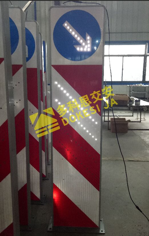 2、基本說明:采用一體式柱體結(jié)構(gòu),標志版面圖案中嵌入LED發(fā)光管,柱體上設(shè)置警示發(fā)光管,采用太陽能蓄電池供電,設(shè)置于中央隔離帶端口。